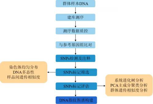 基于前期SNPs位点过滤、筛选可以构建指纹图谱的SNPs标记,并进行系统发育树、主成分分析和遗传相似性等评估,获得的最终的SNPs标记进行区分不同的材料,构建DNA指纹图谱。