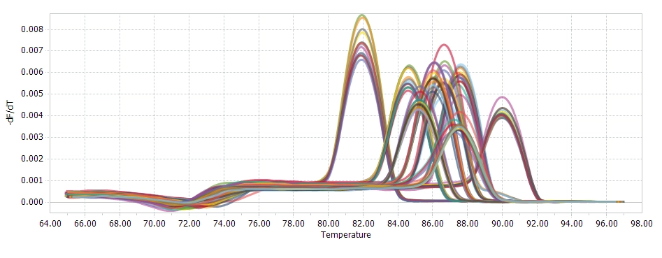 Tm值相同,而峰高低有差异是表达丰度不同,同样的扩增产物也会出现Tm值有微小差异,一般差异在1度以内都可以接受。熔解曲线的纵坐标表示荧光信号对温度的一阶负导数。