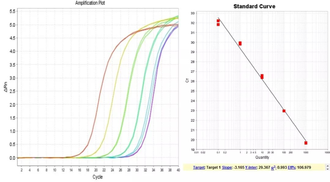 上图中标准曲线最低浓度点被外源DNA污染,导致提前扩增,扩增效率偏高。
