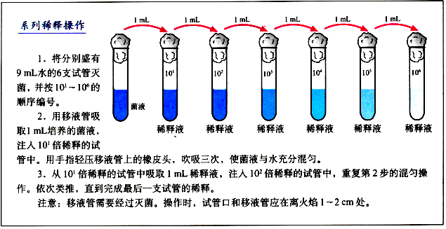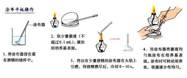 将菌液进行一系列的梯度稀释,然后将不同稀释度的菌液分别涂布到琼脂固体培养基的表面,进行培养。在稀释度足够高的菌液里,聚集在一起的微生物将被分散成单个细胞,从而能在培养基表面形成单个的菌落。