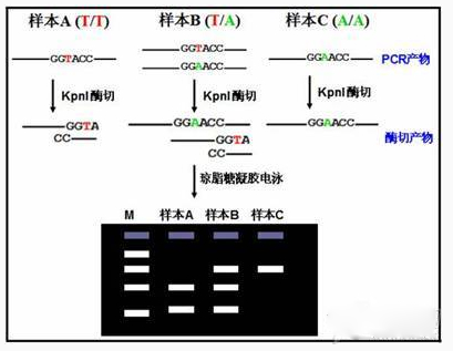 RFLP(Restriction Fragment Length Polymorphism,限制性片段长度多态性)是一种较早的进行 SNP 分型的技术,简单来说就是在包含 SNP 位点的序列中存在有特定的限制性内切酶酶切位点,而 SNP 位点基因型的改变则会使该酶切位点失效,这样根据酶切之后 PCR 片段长度的多态性即可得知对应的基因型,下面用一张图片来示意该方法的实验流程: