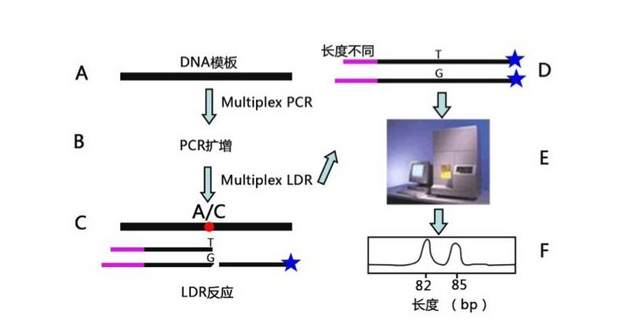 LDR 法是基于核酸特异杂交原理,设计两条 3' 端碱基不一样的鉴别引物用以鉴别 SNP 位点的两种 Allele,同时设计一条在位点另一侧的通用的引物,在高温连接酶的作用下,当左右两条寡核苷酸探针(鉴别引物以及通用引物)与目的 DNA 序列完全互补,并且两条探针之间没有空隙时才能发生连接反应,通过温控循环该特异性连接反应可反复进行,达到线性扩增的效果,最后通过荧光扫描片段长度(在通用引物的合成时已经在一端进行了荧光修饰),实现对 SNP 位点的检测。