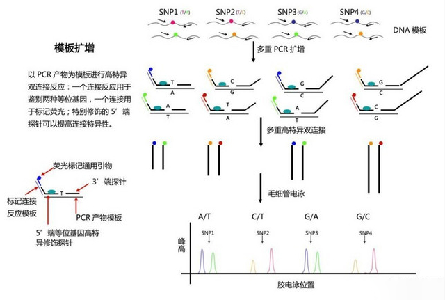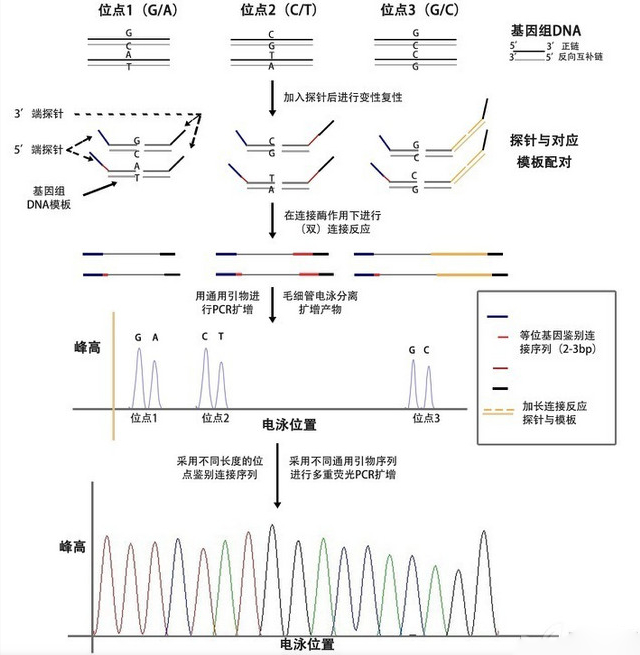 iMLDR 技术是基于传统的连接酶反应经过改进后的多重 SNP 分型技术,相比于传统的连接酶反应技术,iMLDR 提高了准确性和分型的成功率,该方法的特色在于采用了一个双连接反应,将区分基因型的荧光使用连接方法加到连接产物上,这样一来可以轻松的增加该分型方法的通量。
