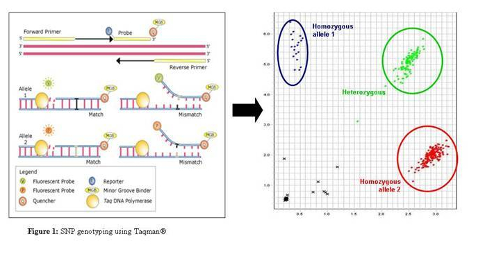 特异的探针与相应的等位基因结合后,DNA 聚合酶发挥 5’到 3’外切酶活性,把报告荧光基团切割下来,脱离 3’端淬灭荧光基团的淬灭作用(quench),从而发出荧光。两个探针的 5’端标有不同的荧光(FAM 或 VIC),3’端标有 MGB 淬灭基团结合体。根据检测到的不同荧光,可以判断相应样本的 SNP 等位基因型。