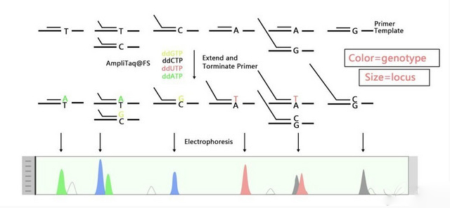 经 ABI 测序仪跑胶后,根据峰的颜色可知掺入的碱基种类,从而确定该样本的基因型,针对不同的 SNP 位点设计不同长度的延伸引物来做到多个 SNP 在一个反应体系中进行分型。
