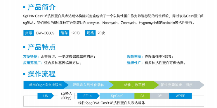SgRNA-Cas9-XR抗性蛋白共表达载体构建试剂盒包含了一个以抗性蛋白作为筛选标记的线性质粒,同时表达Cas9蛋白和sgRNA。我们提供的5种质粒可分别表达Puromycin、Neomycin、Zeomycin、Hygromycin、Blasticidin等抗性蛋白。