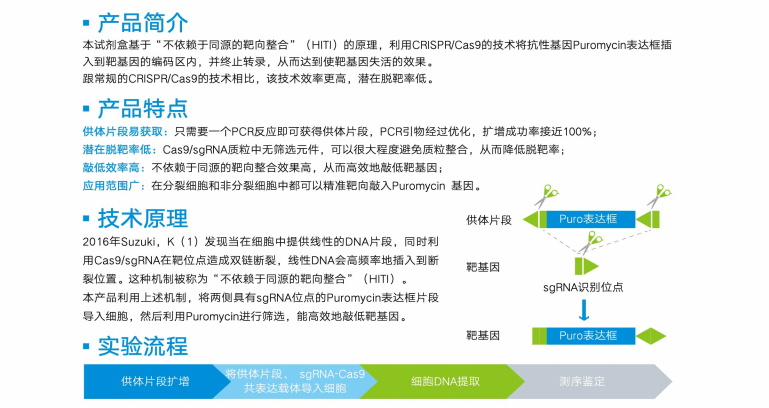 本试剂盒基于“不依赖于同源的靶向整合”(HiTi)的原理,利用CRISPR/Cas9的技术将抗性基因Puromycin表达框插入到靶基因的编码区,并终止转录,从而达到使靶基因失活的效果。