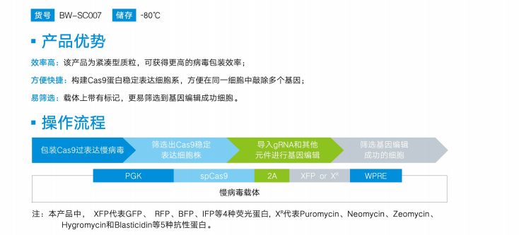 Cas9慢病毒颗粒为紧凑型质粒,通过构建稳定表达Cas9蛋白的细胞株,可以更自由地设计基因编辑株系,也可以提供更好的Cas9蛋白表达效率,从而获得更高的病毒包装效率。我们共提供Cas9和荧光蛋白(GFP、RFP、BFP、IFP)或者抗性基因(Puromycin、Neomycin、Zeomycin、Hygromycin、Blasticidin)的9种慢病毒颗粒。