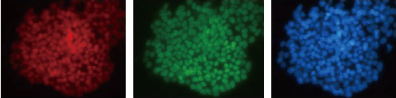图-用 本产品培养的 人类多能 干细胞形成紧致的克隆 图-人类多能干细胞在本产品中培养 15代之后进行多能性蛋白表达的鉴定 。从左至右依次为 Sox2 、Oct4 、Hochest。